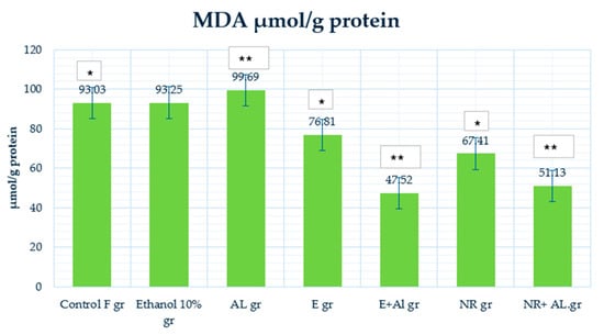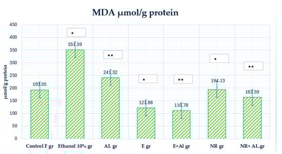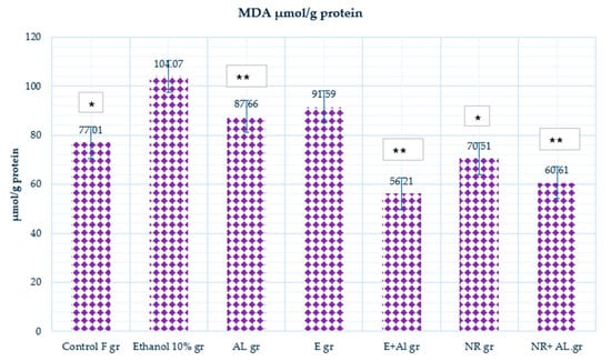 The level of MDA in the NR group (194.13 µmol/g of protein) was similar to that in the control group, but compared to the ethanol group, it showed a statistically significant decrease.