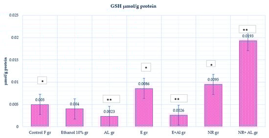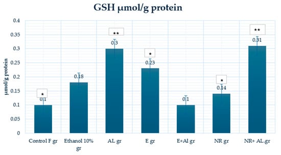The concentration of GSH in mouse blood. * Indicates a statistically significant difference between the control group and the treated group with E and NR (p ≤ 0.05); ** indicates a statistically significant difference between the Al group and the treated group with the E + Al and NR + Al groups (p ≤ 0.05).