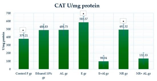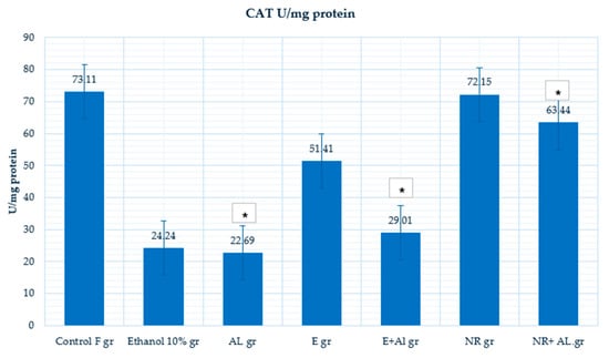 CAT activity in the mouse liver. * Indicates a statistically significant difference (p ≤ 0.05) between the ethanolic and treated groups.