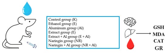 Naringin (NR) (≥95% purity)—Sigma Aldrich (Steinheim, Germany); ethanol (96%)—Vilniaus Degtinė (Vilnius, Lithuania); AlCl3 (aluminum chloride)—Sigma Aldrich (Steinheim, Germany); GSH (reduced glutathione)—Sigma Aldrich (Steinheim, Germany); MDA (malondialdehyde)—Sigma Aldrich (Steinheim, Germany); TBA (thiobarbituric acid), tris-HCl (tris-hydrochloride), DTNB (5,5-dithiobis-(2-nitrobenzoic acid) were supplied by Serva, Heidelberg, Germany; TCA (trichloroacetic acid)—Merck (Darmstadt, Germany).