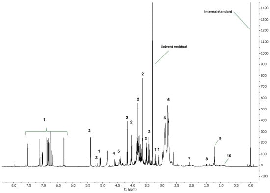 As previously described [], the 1H NMR profiling of MO extract revealed the presence of both primary and secondary metabolites in MO. Specifically, sugars, amino acids, and organic acids were identified, including α-glucose, β-glucose, sucrose, alanine, valine, citrate, and acetate. Additionally, the aromatic region of the spectrum exhibited prominent signals ascribable to RA (Figure 1).