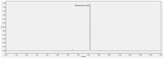 UPLC-DAD analysis was performed to estimate the total polyphenol content and the specific content of RA in the MO. Total polyphenols, expressed as equivalent of RA, were quantified by comparing peak areas measured at 330 nm wavelength to those of the calibration curve of the RA reference standard. The total polyphenol content, identified by its characteristic spectrum with λmax at 330 nm and expressed as RA equivalents, was 5.17 ± 0.1% w/w. The RA content, calculated by measuring the peak area at a retention time of 7.5, was 4.02 ± 0.1% w/w. The chromatographic profile of the MO is shown in Figure 2.