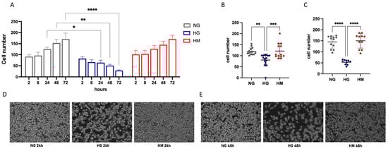 Time-dependent reduction in BV2 cell number by high glucose (HG) exposure. (A) BV2 cell number in cultures exposed to normal glucose (NG; 5.5 mM), high glucose (HG; 25 mM), or high mannitol (HM; 25 mM) concentrations at different time points (2, 8, 24, 48, and 72 h). Scatter plots of data obtained after 24 h (B) or 48 (C) hours of treatment. * p < 0.05, ** p < 0.01, *** p < 0.001, **** p < 0.0001. Representative images of HG-exposed cells after 24 h (D) and 48 h (E). Scale bar: 50 µm.
