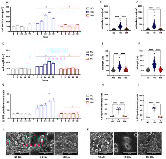 Morphological analysis of BV2 cells exposed to high glucose (HG). (A) Soma cell surface area of BV2 cells exposed to normal glucose (NG; 5.5 mM), high glucose (HG; 25 mM), or high mannitol (HM; 25 mM) concentrations at different time points (2, 8, 24, 48, and 72 h). * p < 0.05 vs. NG; ° p < 0.05 versus HG. Scatter plots of data obtained after 24 h (B) or 48 (C) hours of treatment. **** p < 0.0001. (D) BV2 cell length after exposure to NG, HG, and HM at different time points (2, 8, 24, 48, and 72 h). * p < 0.05 vs. NG; ° p < 0.05 versus HG. Scatter plots of data obtained after 24 h (E) or 48 (F) hours of treatment. **** p < 0.0001. (G) Increase in the percentage of cells in the proinflammatory state after stimulation with HG at different time points (2, 8, 24, 48, and 72 h) in comparison with NG and HM. * p < 0.05 vs. NG; ° p < 0.05 versus HG. Scatter plots of data obtained after 24 h (H) or 48 (I) hours of treatment. **** p < 0.0001. Representative images of HG-exposed cells after 24 h (J) and 48 h (K). Scale bar: 50 µm.