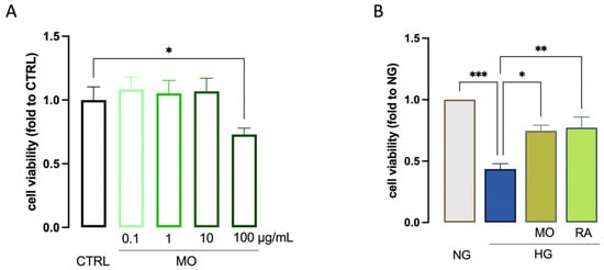 Effect of MO on cell viability. (A) Lack of alteration of cell viability by MO (0.1–100 µg/mL) in unstimulated BV2 cells. (B) MO (10 µg/mL) and RA (0.4 µg/mL) attenuation of HG-induced reduction of cell viability. * p < 0.05, ** p < 0.01*** p < 0.001.