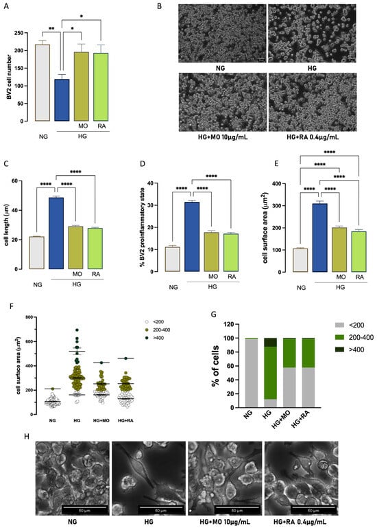 Attenuation by MO and RA of HG–induced proinflammatory morphological phenotype in BV2 cells. MO (10 µg/mL) and RA (0.4 µg/mL) attenuation of HG–induced cell number reduction (quantitative analysis (A); representative images (B)), cell length (C), percentage of cells in the proinflammatory state (D), and cell surface area (E). (F) Redistribution of HG–exposed BV2 cell subpopulations by cell surface area after 48 h of stimulation in the presence or absence of MO and RA. Cells were classified as either small (<200 μm2), mid-sized (200–400 μm2), or large (>400 μm2). (G) Effect of MO and CH on HG–induced variation of the percentage of distribution of cells by size. * p < 0.05, ** p <0.01, **** p < 0.0001. (H) Representative images of HG-exposed cells. Scale bar: 50 µm.