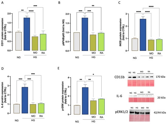 MO and RA inhibition of microglia activation and neuroinflammation. (A) Increase in CD11b expression by HG exposure and attenuation by MO (10 µg/mL) ND RA 0.4 µg/mL). Inhibition of HG-induced p65 overphosphorylation (B), induction of iNOS expression (C), IL-6 expression (D), and ERK1/2 (E) increased phosphorylation by MO and RA. * p < 0.05, ** p < 0.01, *** p < 0.001, **** p < 0.0001. Representative blots for western blotting analysis of CD11b, IL-6, and pERK1/2 are reported.
