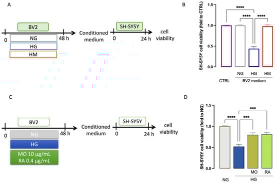 Neuroprotective effect of MO and RA on SH-SY5Y. (A) Schematic representation of experimental protocol and (B) reduction of cell viability in SH-SY5Y cells exposed to conditioned medium from HG-stimulated BV2 cells compared to NG- and HM-stimulated. CTRL cells were not exposed to the BV2 medium. (C) Schematic representation of experimental protocol and (D) protection by MO and RA treatment from neurotoxicity in SH-SY5Y cells induced by conditioned medium from HG-exposed BV2 cells. *** p < 0.001, **** p < 0.0001.