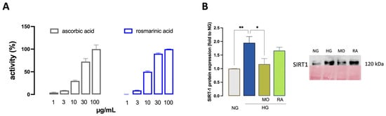 Antioxidant activity of MO and RA. (A) Anti-radical scavenger activity of rosmarinic acid (RA) (1–100 μg/mL) in the DPPH test. Ascorbic acid was used as a reference drug. (B) Reduction of the overexpression of SIRT1 by MO of HG-exposed BV2 cells. * p < 0.05, ** p < 0.01.