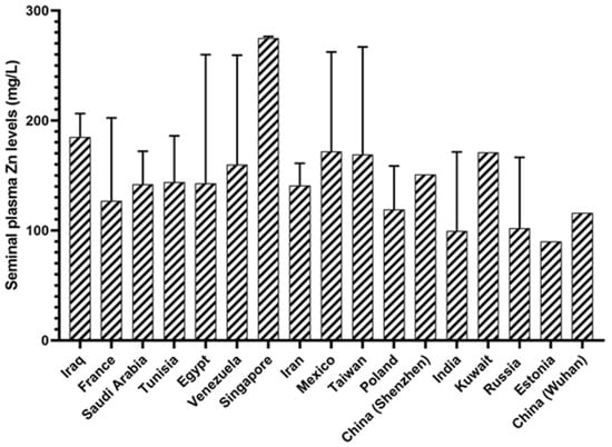 According to the literature data, Zn levels in the seminal plasma of fertile men are partially available among populations worldwide. In this review analysis, we enrolled those studies that adhered to the 2010 WHO laboratory manual for the examination and processing of human semen. In addition, all studies that did not specify exclusion criteria for fertile participants (primarily ejaculatory obstruction, testicular failure, inadequate sperm concentration or absence, aberrant sperm morphology and motility, age, obesity (BMI ≥ 30)) were not considered in this review. The results for seminal plasma Zn levels of normozoospermic men worldwide are shown in Figure 1. Generally, with the exception of Singapore, Zn levels in seminal plasma ranging roughly from 100 to 200 mg/L can be considered safe for male fertility. The authors of this review urge researchers to determine Zn levels in the seminal plasma of subjects in as many countries as possible, even in regions of the same country, to draw more reliable (statistical) conclusions about seminal plasma Zn levels of fertile men across the world.
