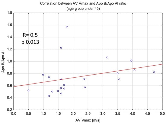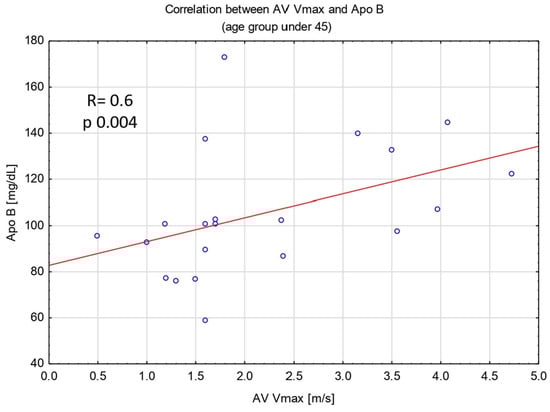 Patients aged ≤45 with AS in comparison to those without AS had significantly higher levels of Apo B [110.5 (102–132) vs. 95.6 (77–101) mg/dL; p 0.044] and Apo B/Apo AI ratio [(0.8 (0.7–1) vs. 0.6 (0.5–0.7); p 0.029]. We found no differences in the level of TC, HDL-C, LDL-C, and TG. Moreover, in the group aged ≤45, Apo B level and Apo B/Apo AI ratio showed a positive correlation with AV Vmax measurement (R Spearman was 0.6 for Apo B and AV Vmax, and 0.5 for Apo B/Apo AI and AV Vmax, p < 0.05 for both analyses) (Figure 1 and Figure 2). Furthermore, in the group aged ≤45, patients with AS had significantly lower activity of PON-1 ARE compared to those without AS [63.4 (52–80) vs. 85.3 (70–102) U/L; p 0.0124].