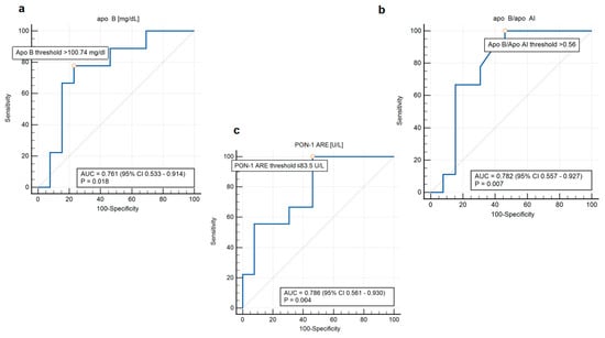 ROC curves of Apo B levels (a), Apo B/Apo AI ratio (b), PON-1 ARE (c) activity and the presence of AS for patients aged ≤45. Abbreviations: AUC—Area Under the Curve; CI—Confidence Interval; Apo B—apolipoprotein B; Apo AI—apolipoprotein AI; PON-1 ARE—arylesterase activity.