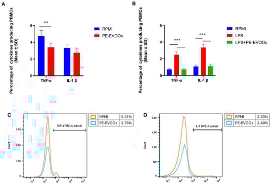 PE-EVOOs reduce the production of pro-inflammatory cytokines from RA patients and HS LPS-stimulated PBMCs. Cumulative data obtained from flow cytometric analyses of RA patients (A) and HS LPS-stimulated (B) PBMCs intracellularly stained for TNF-α and IL-1β show that both cytokines decreased after 48 h of 10 µg/mL PE-EVOO treatment. Histogram overlays of the production of TNF-α (C) and IL-1β (D) from an RA representative patient. ** p < 0.01 and *** p < 0.001 with respect to cells cultured in medium alone (RPMI) or with LPS (LPS).
