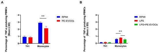PE-EVOOs reduce TNF-α production only from monocytes and not from T helper cells. Cumulative data obtained from flow cytometric analyses of RA patients (A) and HS LPS-stimulated (B) PBMCs intracellularly stained for TNF-α production from Th1 cells and monocytes show that only monocytes producing TNF-α decreased after 48 h of 10 µg/mL PE-EVOO treatment. ** p < 0.01 with respect to cells cultured in medium alone (RPMI) or with LPS.