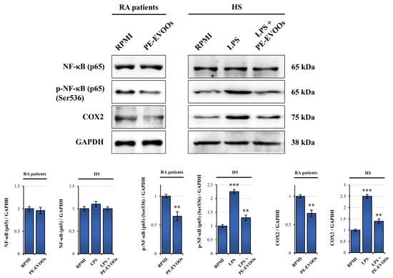 PE-EVOOs exert anti-inflammatory effects by reducing the expression of the active form of NF-κB and COX2. Western blotting analysis of NF-κB, phosphorylated-NF-κB, and COX2 in RA patients and HS LPS-stimulated PBMCs treated for 48 h with 10 µg/mL of PE-EVOOs. Equal loading of proteins was verified by immunoblotting for GAPDH. The bar graphs represent the mean of three independent experiments. ** p < 0.01 and *** p < 0.001 with respect to cells cultured in medium alone (RPMI).