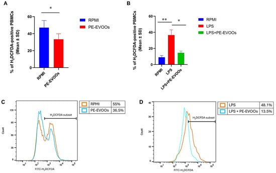 PE-EVOOs exert antioxidant effects in RA patients and HS LPS-stimulated PBMCs. Cumulative data obtained from flow cytometric analysis of RA patients (A) and HS LPS-stimulated (B) PBMCs treated for 48 h with 10 µg/mL of PE-EVOOs stained for intracellular ROS using the redox-sensitive fluorochrome H2-DCFDA, as reported in the Section 2. Histogram overlays of intracellular ROS production obtained from PBMCs of a representative RA patient (C) and HSs (D). * p < 0.05 and ** p < 0.01 with respect to cells cultured in medium alone (RPMI) or with LPS.