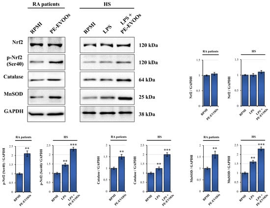PE-EVOOs exert antioxidant effects upregulating the active form of Nrf2 and its transcriptional targets, catalase and MnSOD. Western blotting analysis of Nrf2, p-Nrf2 (Ser 40), catalase, and MnSOD in RA patients and HS LPS-stimulated PBMCs treated for 48 h with 10 µg/mL of PE-EVOOs. Equal loading of proteins was verified by immunoblotting for GAPDH. The bar graphs represent the mean of three independent experiments ± SD. ** p < 0.01 and *** p < 0.001 with respect to cells cultured in medium alone (RPMI).