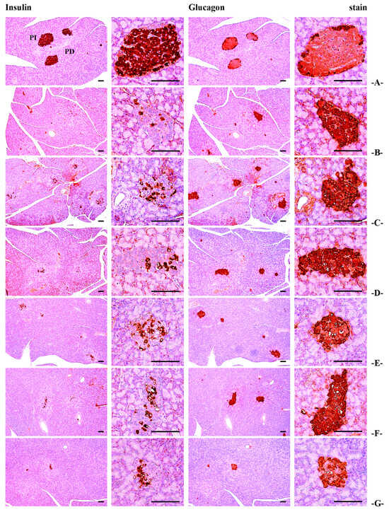 | Item (Unit) | Numbers/10 mm2 | Diameters (μm) | Collagen Occupied Regions (%/mm2) | Insulin Cells (numbers/mm2) | Glucagon Cells (numbers/mm2) | Insulin/Glucagon Cell Ratio | |
