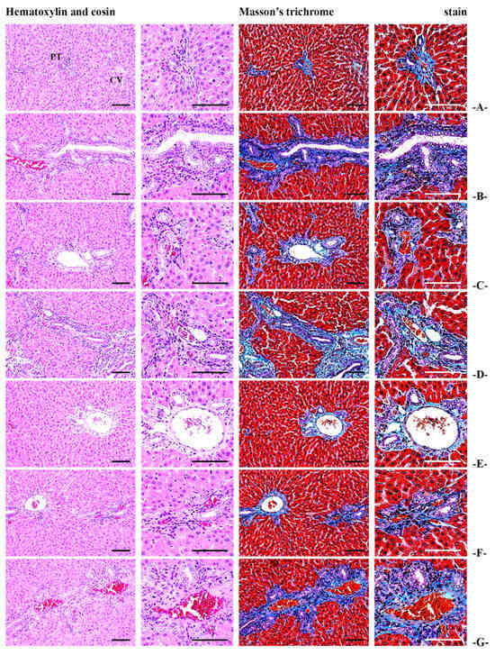 | Group | Bile Ducts (Numbers/mm2) | Inflammatory Cells (numbers/mm2) | Collagen-Occupied Regions (%/mm2) | ||