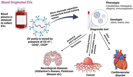 Isolating and purifying extracellular vesicles (EVs) from blood is challenging due to the complexity of separating them from plasma proteins. Despite these difficulties, the EV proteome contains valuable genetic materials, including mRNA, miRNA, and DNA, as well as proteins like immunoglobulins and integrins. High levels of glycoproteins and lipoproteins, such as cholesterol, further complicate this process. In cancer, the disease stage can be determined by analyzing proteins, mutant DNA, and tumor proteomes in EVs. Elevated levels of CD31 and annexin A5 are also noted in patients with rheumatoid and cardiovascular diseases (Figure 1) [26,27]. A study using immunomagnetic beads separated plasma CD31+ EVs from tissues related to type 2 diabetes mellitus (T2DM). The researchers identified 11 miRNAs related to vascular performance and shuttled by CD31+ EVs in a large sample of T2DM patients. Ten miRNAs were altered by T2DM, but the signature of miR-146a, -320a, -422a, and -451a successfully identified T2DM patients with problems. Another miRNA signature identified T2DM patients with a past significant adverse cardiovascular event. The study suggests that plasma CD31+ EVs’ miRNA cargo is heavily influenced by T2DM and associated problems [27].