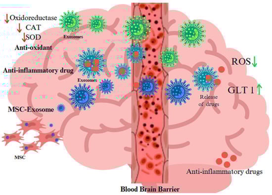 EVs are relevant elements because of their notable ability to cross the BBB. Based on their cellular origin, several systems play a role in this process, which may be impacted by neuroimmune disorders. It is more plausible that EVs use the same methods as viruses to cross the BBB. Research has indicated that the ability of EVs to penetrate the BBB is partly attributed to the endocytic process. Based on existing knowledge, it is hypothesized that EVs use transcytosis to cross the BBB. In this mechanism, cells pass through vesicles in a manner similar to adsorptive transcytosis. Viruses, immune cells, and nanoparticles employ this type of mechanism to cross the BBB [40]. Besides MSC, an exosome has a significant mechanism to reduce oxidative stress by direct ROS scavenging, suppressing inflammatory proteins, inducing mitochondrial protection, and cellular biogenesis [63]. Oxidative stress is associated with neurodegeneration in Parkinson’s patients, with etiology attributed to a deficiency of natural anti-oxidants such as catalase, glutathione, and superoxide dismutase in the midbrain area. Release of inflammatory cytokines by immune cells results in neuronal death. Anti-oxidants may suppress inflammatory reactions and save dopaminergic neurons, as shown in laboratory and animal studies. Catalase, a potent anti-oxidant, has shown the ability to protect primary cerebellar granule cells in Parkinson’s disease models. Nonetheless, clinical trials have shown inadequate pharmacokinetics and a failure to traverse the blood–brain barrier [32].