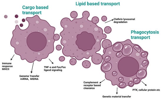 Exosome-based transport pathways involved in aging. Abbreviations: MHC II, Major histocompatibility class II; miRNA, MicroRNA; mtDNA, Mitochondrial DNA; TNF-α/Fas, Tumor necrosis factor α and Fas membrane-bound protein; PTK, Protein tyrosine kinase. Created with BioRender.com (accessed on 23 December 2024).