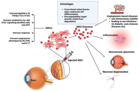 Exosomal MSC-based ocular therapy. Created with BioRender.com (accessed on 23 December 2024). Abbreviations: MSCs, Mesenchymal stomal cells; APCs, Antigen-presenting cells. Created with BioRender.com (accessed on 23 December 2024).