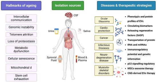 Overview on hallmarks of aging, isolation sources, diseases, and therapeutic strategies. Created with BioRender.com (accessed on 23 December 2024).