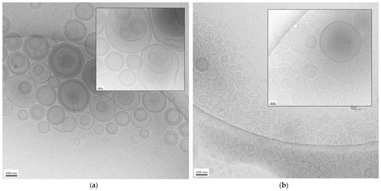 In both cases, the formation of mostly spherical or ovoidal vesicles was observed, in agreement with PCS analysis data. In the case of ETWI (panel a and inset), the prevalence of multilamellar and oligolamellar vesicles is observable. In contrast, in the case of ETEI (panel b and inset), a majority of unilamellar and oligolamellar vesicles is evident, suggesting the different preparation methods influenced vesicle morphology. It is possible to assume that the rapid depletion of the organic solvent in the ethanol injection method leads to quicker vesiculation, thereby hindering the formation of multilamellar structures. On the contrary, the addition of water to the excess PC–ethanol solution not only promotes more gradual vesiculation, leading to the formation of larger structures, but also the assembly of multiple bilayers, resulting in a predominance of oligolamellar and multilamellar vesicles.