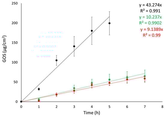 Franz cell apparatus was employed to conduct IVRTs with the objective of evaluating the ETs’ capability to control GOS release. Synthetic nylon membrane was selected as an inert support to separate the upper and lower compartments. In the study, the release of GOS from ET-GOSEI and ET-GOSWI was compared to a 30:70 ethanol/water GOS solution (SOL-GOS) containing GOS 0.3 mg/mL. As expected, the ETs achieved a better control of GOS release compared to SOL-GOS. Indeed, as shown in Figure 2, GOS release from SOL-GOS was much faster compared to the ET forms. No differences were observed between the release profiles obtained in the case of ET-GOSWI and ET-GOSEI.