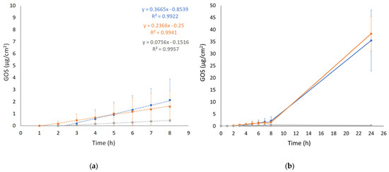 GOS diffusion profiles from ET GOSEI (blue circles), ET GOSWI (orange circles), and SOL GOS (gray circles), as determined by Franz cells associated with STRAT-M® membrane. (a) 0–8 h linearized profile and (b) 0–24 h diffusion. Data are means of 6 independent experiments ± s.d.
