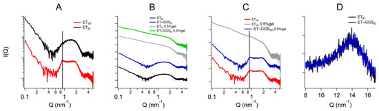 Comparison among the SAXS profiles of ETEI and ETWI (A), ETEI, ET-GOSEI, ET-GOSEI 0.5% gel (B), and ET-GOSWI 0.5% gel (C). Black vertical line in panel C indicates peak in Q position of 0.87 nm−1 visible in each profile. Comparison between WAXS profiles of ETEI and ET-GOSEI (D).