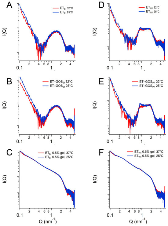 SAXS profiles of ETEI (A), ET-GOSEI (B), ETEI 0.5% gel (C), ETWI (D), ET-GOSWI (E), and ETWI 0.5% gel (F) at 25 °C and 32 °C.