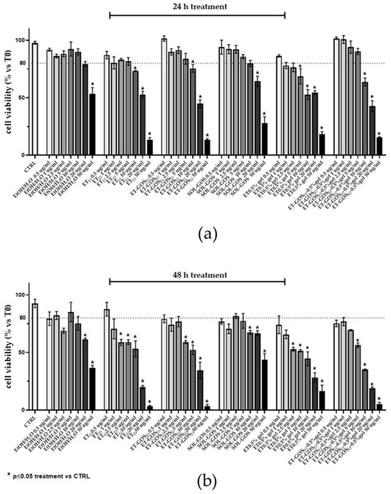First, the cytotoxicity of the formulations was determined by an MTT assay on an A375 melanoma cell line. Specifically, cells were treated with different formulation amounts (i.e., 0.5, 1, 2.5, 5, 10, 20, and 50 µg/mL), evaluating viability after 24 h and 48 h from the treatments.