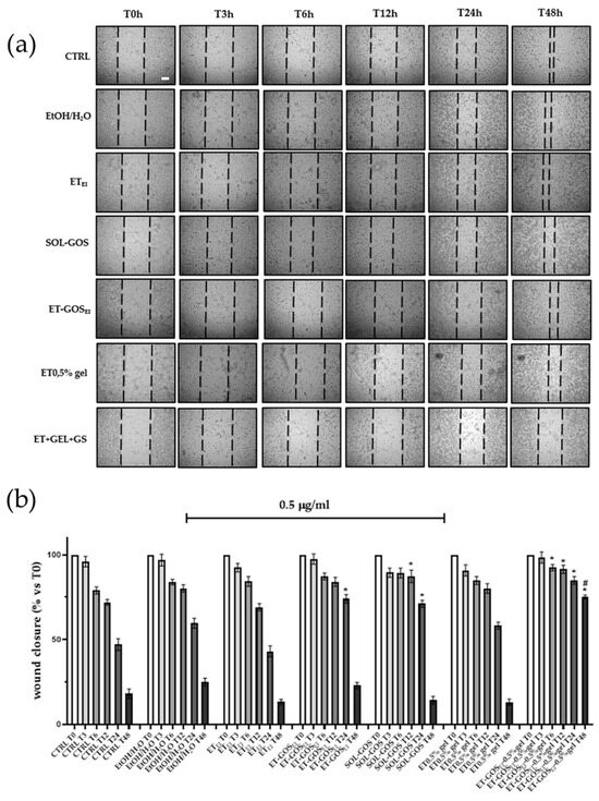 Effect of treatment with 0.5 µg/mL of GOS-loaded or unloaded formulations on wound closure in A375 melanoma cells. (a) Scratch was performed on confluent monolayer of A375 cells and different images were taken to measure wound area at different time points (0, 3, 6, 12, 24, and 48 h; scale bar 200 μm). (b) Quantification of the wound area at each time point via ImageJ. Data are shown as percent of 0 h. Data are results of 3 independent experiments performed in triplicate. * p < 0.05 vs. Ctrl; # p < 0.05 ET-GOSEI-0.5% gel vs. treatment with other two formulations containing GOS by one-way ANOVA.