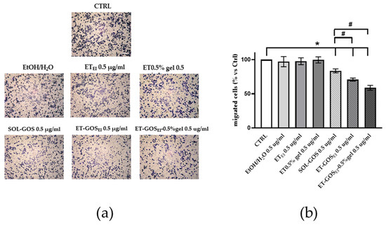 Since the in vitro scratch assay could not distinguish the effects of proliferation from migration, a transwell migration assay was conducted to better understand the possible role of GOS-loaded or unloaded formulations on melanoma cell migration. As shown in Figure 8, after 24 h of pretreatment of A375 melanoma cells with vehicle or with GOS-unloaded formulations, no migratory effect was observed, excluding any potential migratory effect due to the control formulations. Conversely, upon SOL-GOS, ET-GOSEI, and ET-GOSEI-0.5% gel treatment, a significant reduction in cellular migration was noticed. This effect was particularly significant in the case of ET-GOSEI-0.5% gel; indeed, in this case, the migratory ability was not only reduced when compared to the control condition, but also when compared to SOL-GOS and ET-GOSEI, confirming the delayed wound closure results reported above (Figure 8).