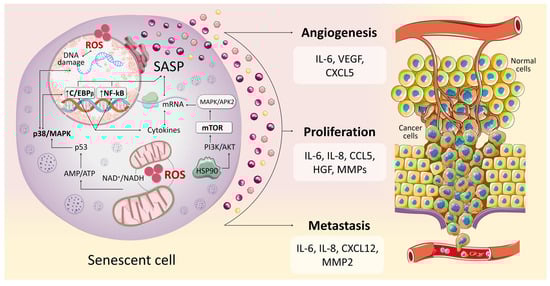 Key signaling pathways and mechanisms involved in the formation of the senescence-associated secretory phenotype (left side of the figure) and their impact on oncogenesis (right side of the figure). SASP is produced under the influence of various pathways, the key ones being NF-kB, PI3K-AKT-mTOR, p38 MAPK, and C/EBP-β, which are critically dependent on the production of reactive oxygen species. ROS and products formed as a result of reactions of the mitochondrial electron transport respiratory chain accumulate during cellular senescence and lead to the activation of the above pathways, and also themselves cause DNA damage. All this leads to increased secretion of SASP factors. In turn, SASP factors play a critical role in the pathogenesis of malignant neoplasms, affecting the tumor microenvironment. The chronic proinflammatory and immunosuppressive state formed under the influence of SASP increases the malignant potential of the cancer cell population. This is expressed in the strengthening of the processes of angiogenesis, proliferation, and metastasis. Abbreviations: IL-6, Interleukin-6; VEGF, Vascular endothelial growth factor; CXCL5, C-X-C motif chemokine 5; IL-8, Interleukin-8; CCL5, Chemokine (C-C motif) ligand 5; HGF, Hepatocyte growth factor; MMPs, Matrix metalloproteinases; CXCL12, C-X-C motif chemokine 12; MMP2, Matrix metalloproteinase-2.