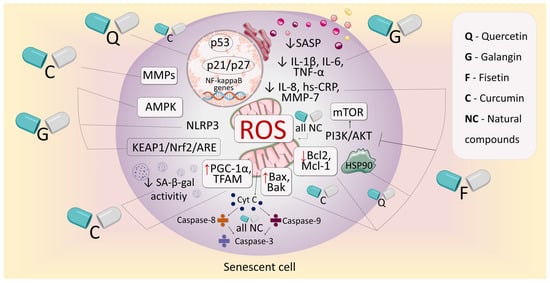 A generalized image of the senotherapeutic potential of the reviewed natural products with pronounced antioxidant activity. Abbreviations: ROS, Reactive oxygen species; SASP, Senescence-associated secretory phenotype; IL-1β, Interleukin-1β; IL-6, Interleukin-6; IL-8, Interleukin-8; MMPs, Matrix metalloproteinases; MMP-7, Matrix metalloproteinase 7; TNF-α, Tumor necrosis factor α; hs-CRP, High-sensitivity C-reactive protein; mTOR, Mammalian target of rapamycin; PI3K, Phosphatidylinositol 3-kinase; Bak, Apoptosis regulator Bak; Bax, Apoptosis regulator Bax; Bcl2, Apoptosis regulator Bcl-2; Hsp90, Heat shock protein 90; Mcl-1, Induced myeloid leukemia cell differentiation protein; PGC-1α, Peroxisome proliferator-activated receptor gamma coactivator 1-α; TFAM, Mitochondrial transcription factor A; SA-β-gal, Senescence-associated β-galactosidase; Nrf2, Nuclear factor erythroid 2-related factor 2; NLRP3, NLR family pyrin domain containing 3 inflammasome; AMPK, AMP-activated protein kinase; ARE, antioxidant response element. The down arrow indicates an inhibition of the activity or expression of factors; the up arrow indicates an increase in the expression of factors.