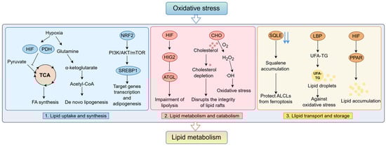 The remodeling of cholesterol metabolism that occurs under conditions of oxidative stress also protects cells from oxidative stress. In ALK+ anaplastic large cell lymphoma (ALCL) cells and primary tumors, squalene accumulation induced by the inhibition of the cholesterol biosynthesis pathway enzyme squalene cyclooxygenase (SQLE) alters the cellular lipid distribution and protects membrane lipids from chemical modification or remodeling, avoiding ferroptosis triggered by the over-oxidation of membrane PUFAs and providing a growth advantage under oxidative stress conditions and in tumor xenografts [145]. ECI2 is a protein present in mitochondria and peroxisomes, and studies have demonstrated its involvement in peroxisome-driven ether lipids in ferroptosis in cancer. In colorectal cancer, the ECI2 protein was found to promote CoA re-entry into the β-oxidation cycle and participate in peroxisomal lipid metabolism [146]. In addition to storing energy, lipid droplets play important roles in alleviating cellular stresses, such as lipotoxic stress, ER stress, and starvation. Therefore, dysfunction or excessive accumulation of lipid droplets is associated with many metabolic diseases and cancers [147]. Lipopolysaccharide-binding protein (LBP) mediates the selective isolation of long-chain polyunsaturated fatty acid-triglyceride (UFA-TG) in LBP into LDs, which effectively prevents lipolysis under oxidative stress. LBP acts as an antioxidant to control lipid homeostasis and protects against oxidative stress by coupling to redox signaling and lipid metabolism [148].