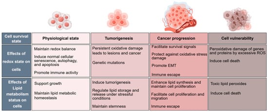 Redox signaling is an important intracellular signaling mechanism. The metabolism of cells provides the material and energy basis for all life activities of living organisms. Redox reactions—i.e., the gain, loss, and transfer of electrons—are key components in the cellular metabolic network [1]. In solid tumors, the rapid growth of tumor tissues, accompanied by a lack of supply from the vascular system, leads to an insufficient supply of oxygen and nutrients within the tumor tissues; here, the tumor microenvironment (TME) presents with overall hypoxia. However, hypoxic conditions are conducive to increasing reactive oxygen species (ROS) levels and oxidative stress. Under hypoxic conditions, cancer cells preferentially choose aerobic glycolysis to provide energy and biosynthetic precursors for their rapid proliferation, which is called the Warburg effect. The process of massive aerobic glycolysis produces more substances, such as ROS, which increases the level of intracellular oxidative stress [2]. This oxidative stress can further induce the activation of relevant signaling pathways and alterations in gene expression, promoting the survival, proliferation, invasion, and metastasis of cancer cells. On the other hand, high levels of oxidative stress interact with and counterbalance cellular metabolism, such as lipid homeostasis. Lipid metabolism, an essential physiological process, is aberrantly activated in tumors due to enhanced lipid synthesis or uptake, contributing to rapid cancer cell growth and tumor formation [3], and lipid metabolism reprogramming is also an important characteristic of cancer. Both oxidative stress and lipid metabolic reprogramming are considered important cancer therapeutic targets, and their related mechanisms constitute important research directions in the fields of cell biology and pharmacy. In this review, we discuss the connection between oxidative stress and lipid metabolic reprogramming in cancer cells and how these two pathways affect tumor development from the perspective of the redox system and metabolism regulation. Finally, we explore the development prospects of targeted lipid metabolism therapy for cancer on the basis of relevant clinical studies in recent years.