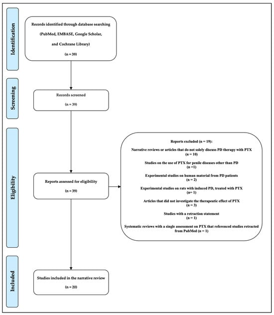 After examining the 39 articles, we considered 20 articles eligible for our paper, including a single randomized controlled clinical study, six clinical studies with a control group, a single uncontrolled clinical study, eight case report studies, and four systematic review articles. We excluded 19 articles for the following reasons: in 10 cases, the articles were narrative reviews or simple articles in which not only PTX was mentioned as a therapeutic option; in 1 study, PTX was not used to treat PD but, instead, was used to treat other penile diseases; 2 experimental studies were on human material from patients suffering from PD; a single experimental study where PTX was administered to rats in which PD had been experimentally induced; 3 articles where the therapeutic effect of PTX was not studied; a double-blind, placebo-controlled study with a retraction statement; and a single systematic review was excluded because the assessment related to PTX referred to a study retracted from PubMed (retraction statement).