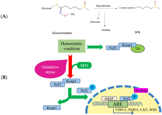Chemical reaction and structure of SFN (A); interaction between Nrf2 and downstream antioxidant enzymes (B) (adapted from [55]).
