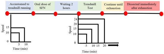 All mice (including sedentary) were accustomed to running on a motorized treadmill (Natsume, Kyoto, Japan) at 15 m/min for 10 min (0% incline) one week before the exhaustive running exercise. On the day of the experiment, SFN (LKT Laboratories, St. Paul, MN, USA, product code S8044) was administered orally (50 mg/kg body weight), solubilized in 150 µL of distilled water, whereas an equivalent volume of distilled water was given to the control group. After two hours of gavage feeding, the uphill treadmill running (7% incline) was started. The Ex and SFN + Ex groups of mice were subjected to run at 15 m/min for 10 min, followed by 20 m/min for 10 min, and finally 24 m/min until exhaustion (Figure 2). The state of exhaustion was defined as the inability to continue running despite tapping on the back of the mouse several times or repositioning on the treadmill using the hand [58,59]. Running time was recorded for exercised mice. Immediately after exhaustion, heparinized blood samples were collected from the abdominal aorta under isoflurane-induced mild anesthesia. Tissue and organs were collected and immediately frozen in liquid nitrogen. Blood samples were centrifuged at 1500× g for 10 min at 4 °C. All the samples were stored at − 80 °C until analysis.
