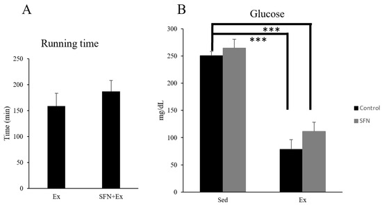 Running time comparison between groups (A). Plasma glucose level comparison between sedentary (SED) and exercise (Ex) groups with (Sulforaphane; SFN) or without (control) treatment (B). Data are presented as the mean ± SE. Statistical significance was defined as p < 0.05 and *** p < 0.001.