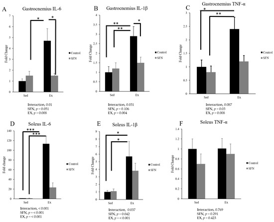 IL-6 mRNA, IL-1β, and TNF-α mRNA expression in the gastrocnemius (A–C) and soleus (D–F) muscles. The comparison was made between sedentary (Sed) and exercise (Ex) groups, with (sulforaphane, SFN) or without (control) supplementation. The interaction effect of SFN intervention and exercise was identified using two-way ANOVA, followed by Tukey’s post-hoc test to determine significant differences among the means of each group. Statistical significance was defined as p < 0.05. * p < 0.05, ** p <0.01, and *** p < 0.001. Data are presented as the mean ± SE.