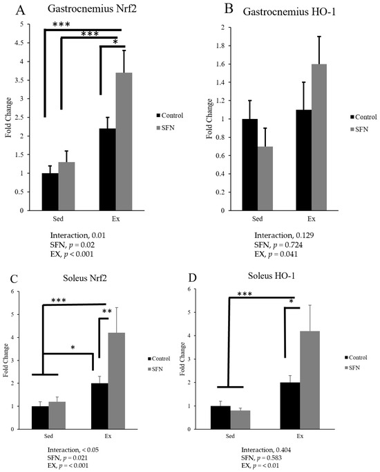 Nrf2 is one of the major transcription factors controlling the antioxidant defense system in both types of skeletal muscle fibers, and the SFN + Ex group significantly increased Nrf2 gene expression compared to the Ex and control groups (Figure 6). In the gastrocnemius muscle, phase 2 enzyme HO-1 expression increased by 1.8-fold in the SFN + Ex group compared to sedentary control, and in the soleus muscle, the expression increased by 4.2-fold in the SFN + Ex group compared to the Ex or sedentary control groups.