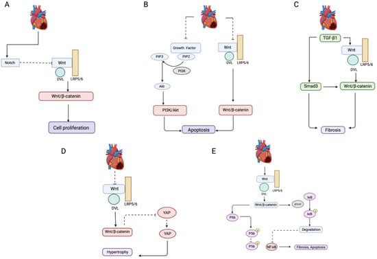 The interplay of Wnt, Notch, PI3K/Akt, TGF-β, NF-κB, and Hippo-YAP signaling pathways during ischemia–reperfusion injury. (A) Crosstalk between Wnt and Notch signaling pathway during ischemia–reperfusion injury. Activated Notch signaling inhibits the Wnt signaling transduction and restores the proliferation ability of certain cardiomyocytes. (B) Crosstalk between Wnt and PI3K/Akt signaling pathway during ischemia–reperfusion injury. PI3K/Akt and Wnt/β-catenin signaling pathways are downregulated in ischemia–reperfusion injury. This downregulation inhibits the crosstalk between these pathways, ultimately resulting in cardiomyocyte apoptosis and left ventricular dysfunction. (C) Crosstalk between the Wnt and TGF-β signaling pathways during ischemia injury. After myocardial ischemia, there is an increased expression of TGF-β1, which activates the Wnt/β-catenin signaling pathway. These two pathways work synergistically to promote the process of myocardial fibrosis. (D) Crosstalk between the Wnt and Hippo-YAP signaling pathways during ischemia–reperfusion injury. Following myocardial ischemia–reperfusion injury, the Wnt/β-catenin signaling is downregulated, leading to the inhibition of YAP1 transcription. Consequently, the activity of the Hippo-YAP signaling pathway is suppressed. This cooperative effect between the two signaling pathways contributes to the promotion of myocardial hypertrophy. (E) Crosstalk between the Wnt and NF-κB signaling pathways during ischemia–reperfusion injury. The upregulated Wnt/β-catenin signaling pathway facilitates the activation of the NF-κB signaling pathway by promoting nuclear translocation of p65; this activation induces the migration of cardiac fibroblasts. Activated Wnt/β-catenin signaling promotes the degradation of phosphorylated IκB mediated through β-TrCP, subsequently promoting the nuclear translocation of NF-κB, leading to myocardial fibrosis and apoptosis. Wnt: wingless-related integration site; Notch: neurogenic locus notch homolog protein; PI3K: phosphatidylinositol-4,5-bisphosphate 3-kinase; AKT: protein kinase B; TGF-β: transforming growth factor β; NF-Kβ: nuclear factor Kappa β; Hippo-YAP: Hippo-Yes-associated protein; IκB: inhibitor of nuclear factor Kappa β; β-TrCP: β-transducin repeat-containing-protein. Dotted arrows indicate inhibition, and regular arrows indicate activation of the pathways.