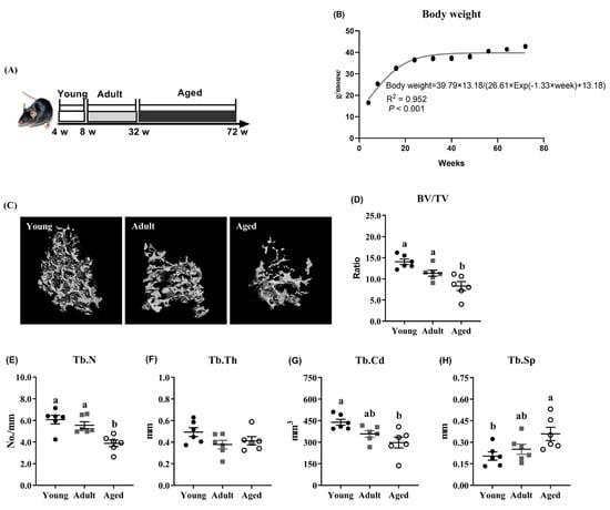 Aging-induced bone loss in mice. (A) Mice were categorized as young (8 weeks), adult (32 weeks) and aged (72 weeks). (B) Body weight. (C) Micro-CT images of tibia trabecular bone. Tibia trabecular bone parameters including (D) the ratio of bone volume to total volume (BV/TV), (E) trabecular number (Tb.N), (F) trabecular thickness (Tb.Th), (G) trabecular connectivity density (Tb.Cd), and (H) trabecular spaces (Tb.Sp). a,b Values (mean ± standard deviation; n = 6) with different letters represent statistical significance at p < 0.05.