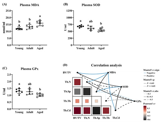 The results of the oxidative status revealed that the plasma MDA level was significantly higher in the aged mice compared to the young and adult mice (p < 0.05; Figure 2A). Additionally, the activities of plasma SOD and GPx were decreased in the aged mice relative to those in the young mice (p < 0.05; Figure 2B,C). As shown in Figure 2D and Table S3, the correlations between the bone characteristics and oxidative status indicated that the plasma MDA level was negatively correlated with the tibia BV/TV, Tb.N, and Tb.Cd values, but was positively correlated with the tibia Tb.Sp value. Conversely, the plasma SOD activity exhibited a positive correlation with the tibia BV/TV and Tb.Cd values and a negative correlation with the tibia Tb.Sp value. Furthermore, the plasma GPx activity was positively correlated with the tibia Tb.N value.