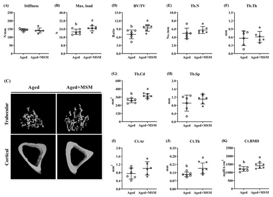 MSM supplementation improved tibia bone mass in aged mice. The mechanical properties were determined including (A) stiffness (the slope of the linear portion of the load–displacement curve) and (B) the maximum force (max. load, Newtons). Tibia was subjected to scans using (C) μCT and bone mass was quantified, including (D) the ratio of bone volume to total volume (BV/TV), (E) trabecular number (Tb.N), (F) trabecular thickness (Tb.Th), (G) trabecular connectivity density (Tb.Cd), and (H) trabecular spaces (Tb.Sp). Tibia cortical bone parameters included (I) cortical area (Ct.Ar), (J) cortical thickness (Ct.Th), and (K) cortical bone mineral density (Ct.BMD). a,b Values (mean ± standard deviation; n = 6) with different letters represent statistical significance at p < 0.05.